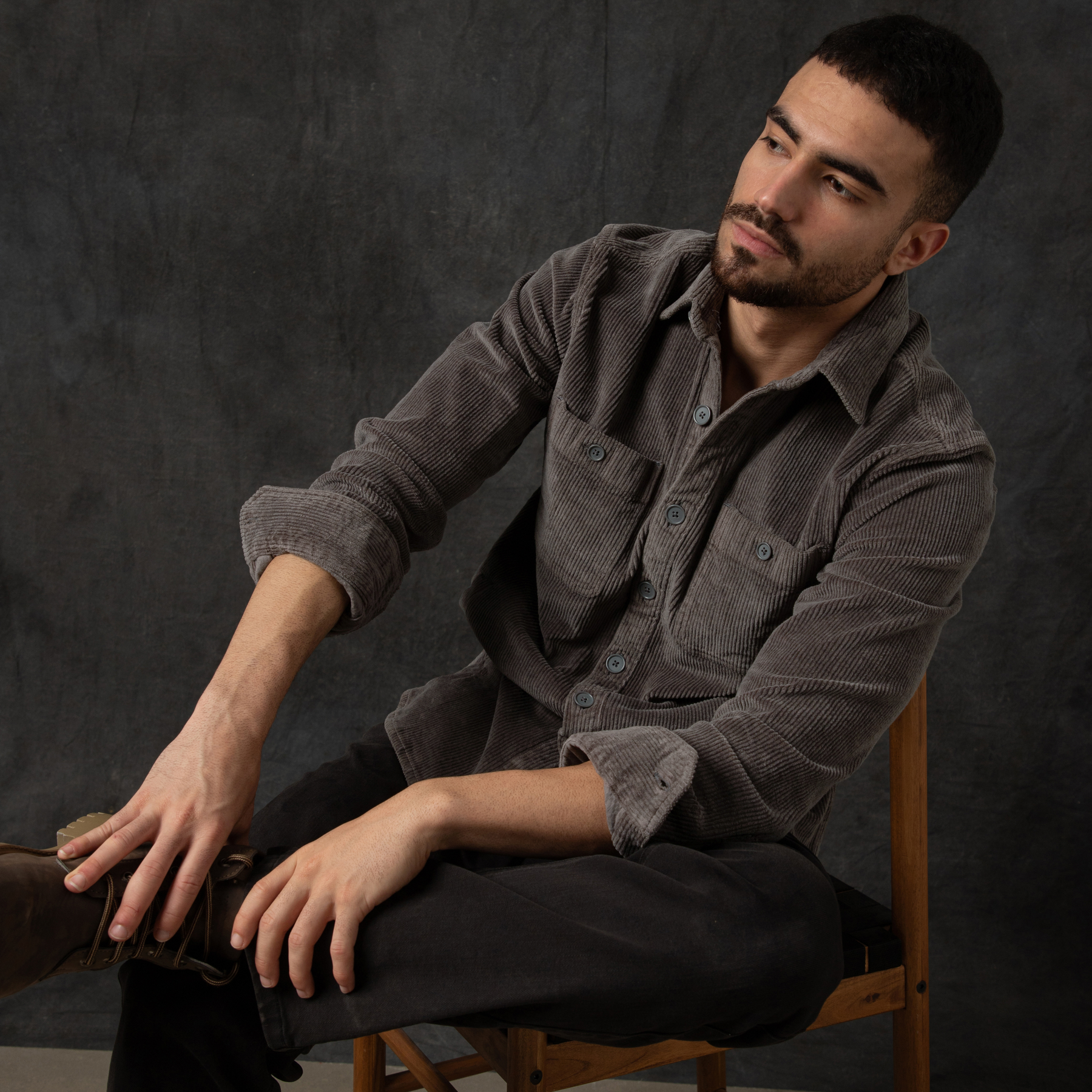 Corduroy Workshirt Dark Grey Backdrop full body on model