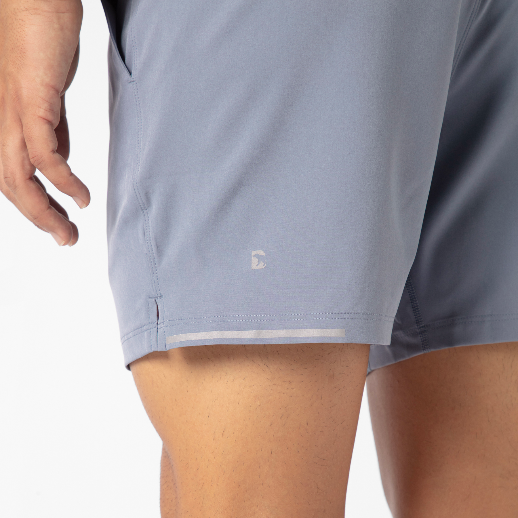 Run Short v2 7" in Shark Grey back close up of left leg with reflective B logo and reflective strip on hem on model