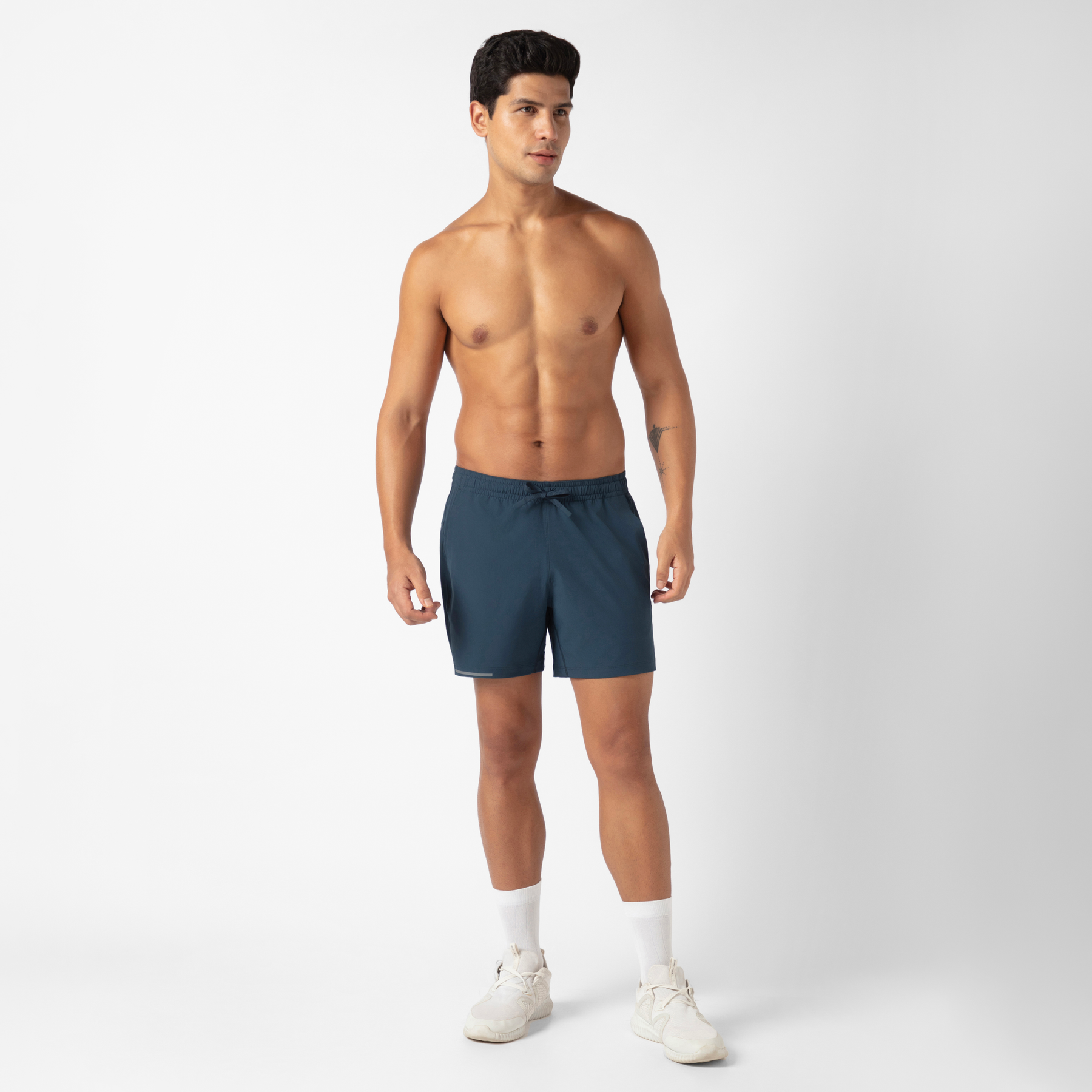 A young, fit man with short dark hair stands against a white background wearing the Run Short v2 in navy, featuring phone pouches. He is shirtless, paired with white socks and sneakers, one hand in his pocket, looking forward.
