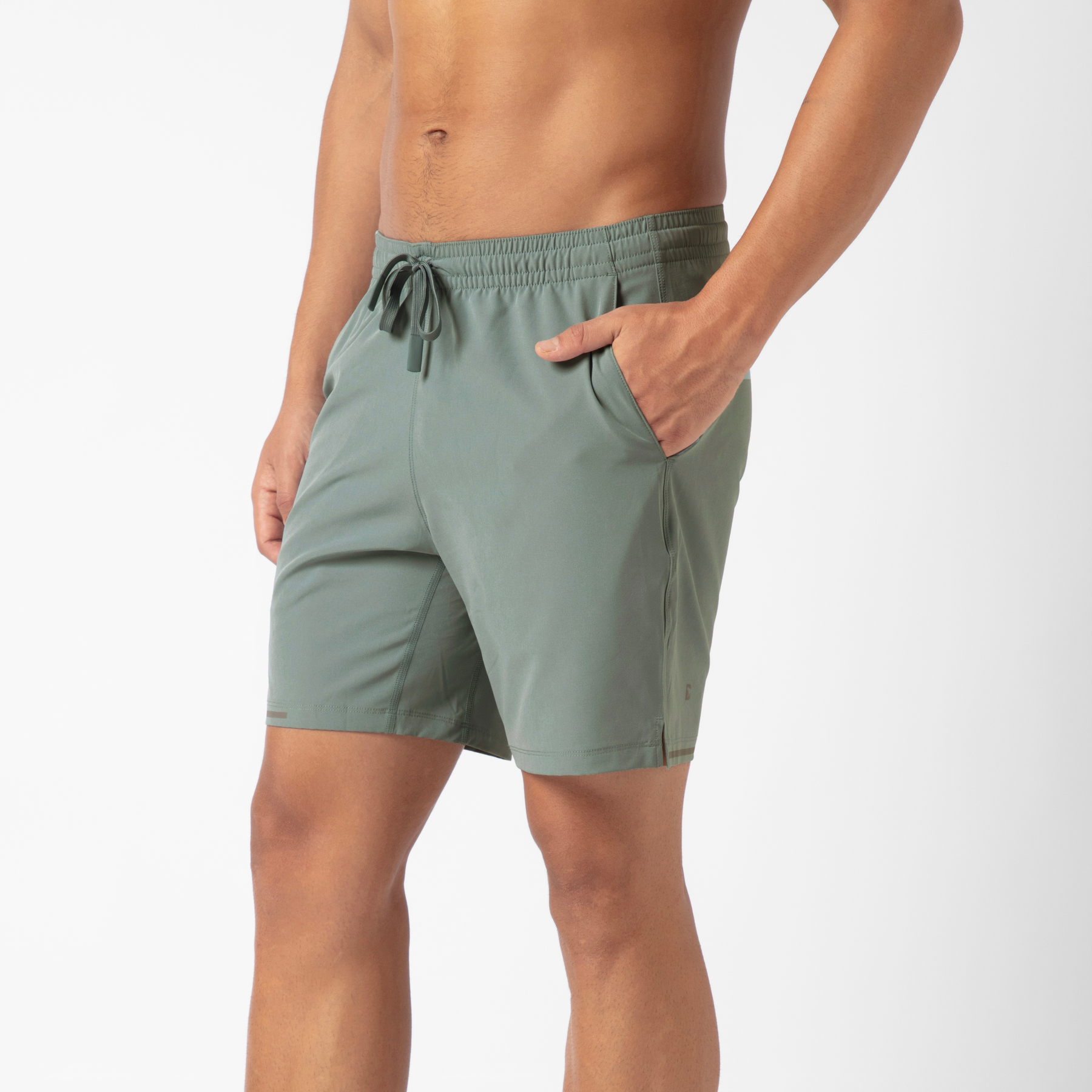A man stands against a white background, one hand in his pocket, wearing Run Short v2 in Military Green, featuring a moisture-wicking fabric and drawstring waistband.
