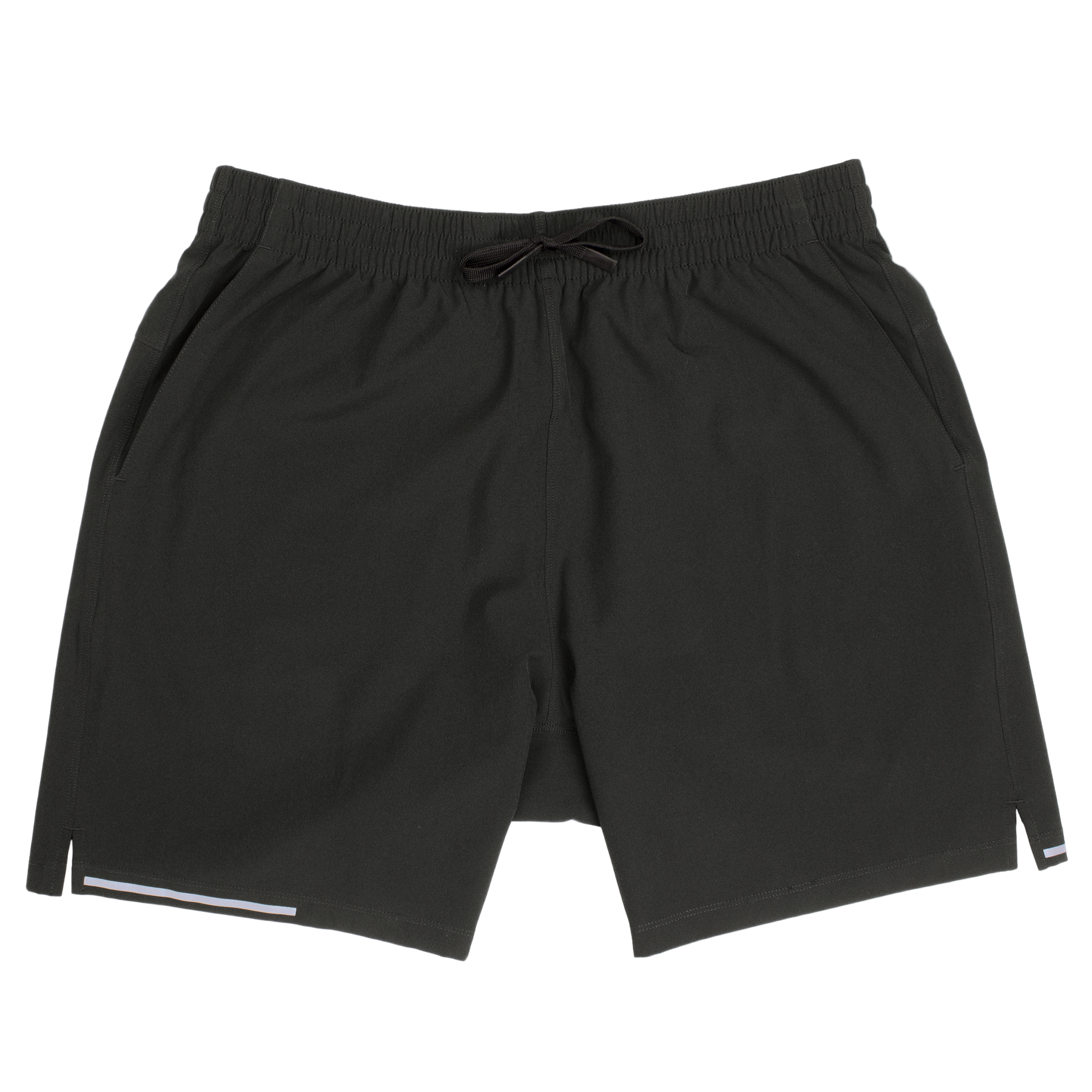 Run Short v2 7" Black front with elastic waistband, dyed-to-match drawstring with rubberized tips, two front pockets, split hem, and reflective line on bottom right hem