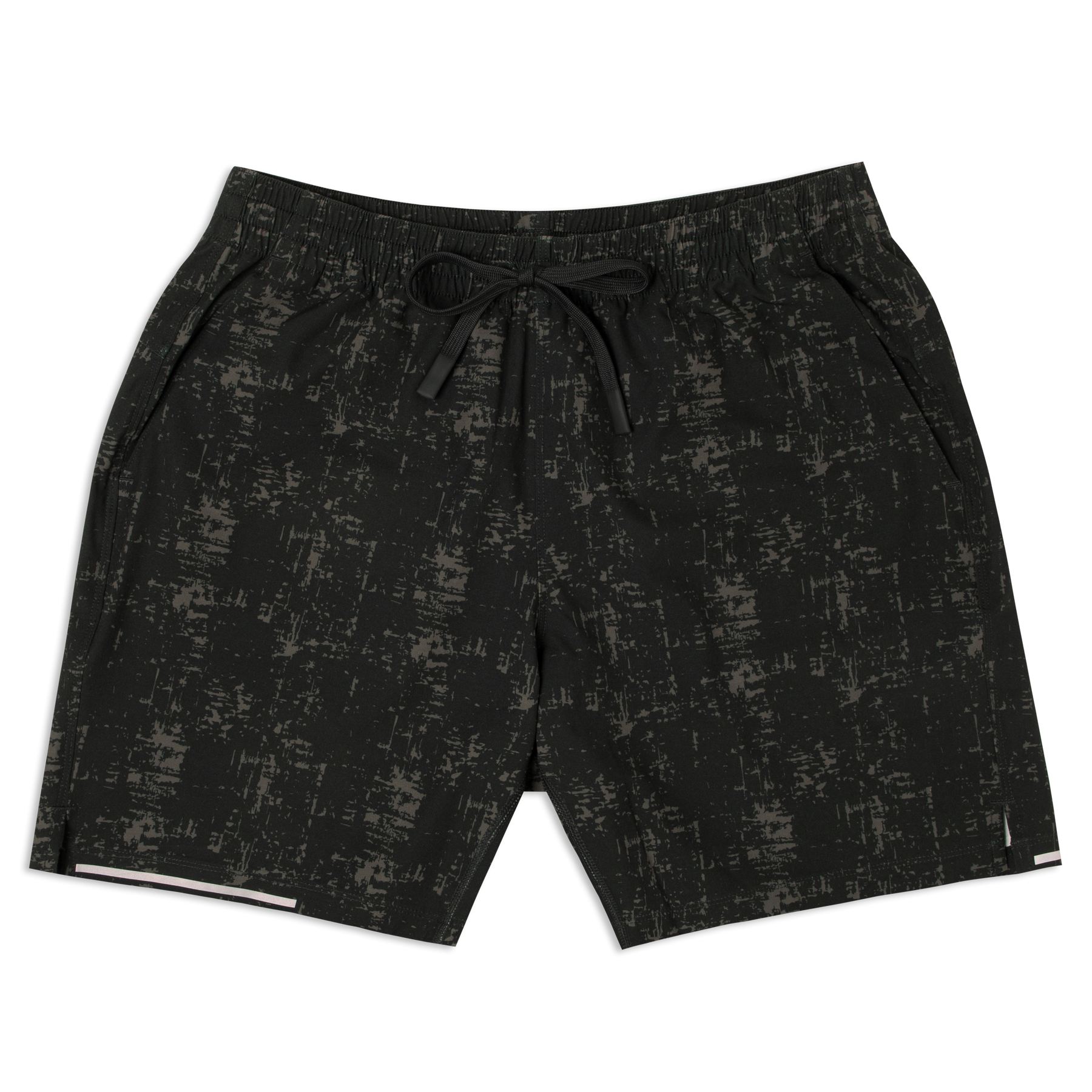 Run Short 5.5" Black front with elastic waistband, dyed-to-match drawstring with rubberized tips, two front pockets, split hem, and reflective line on bottom right hem