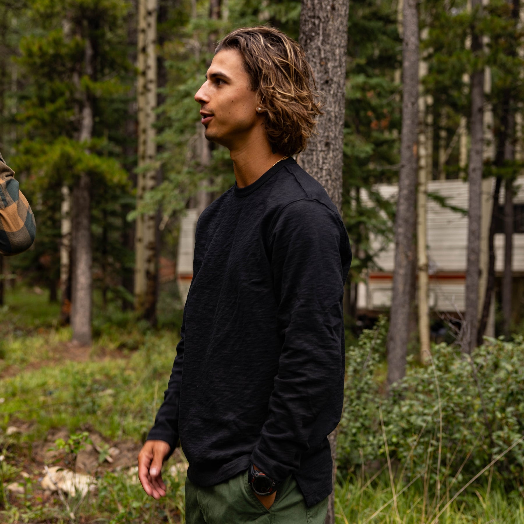 Man in a Rugby Crew Black standing in a forest with a camper van in the background