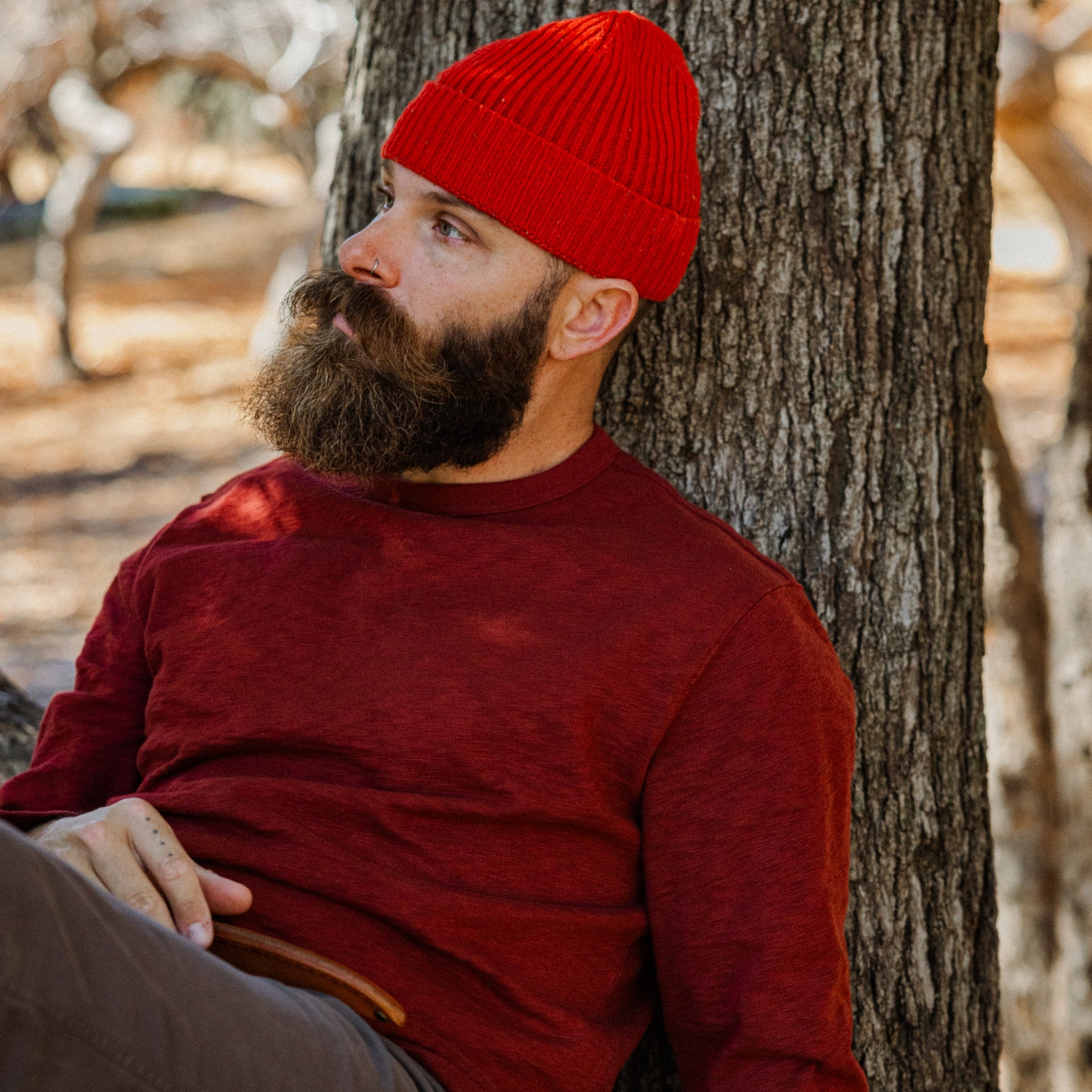 Man wearing a red beanie and Rugby Crew Crimson leaning against a tree in a forest setting